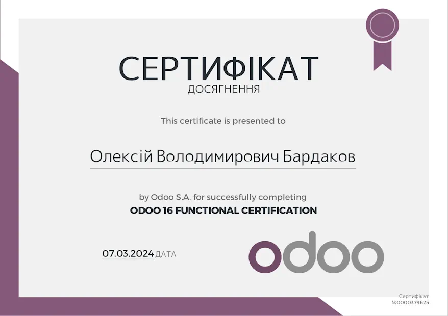 • Bestehen der internen Zertifizierung von Odoo S.A.